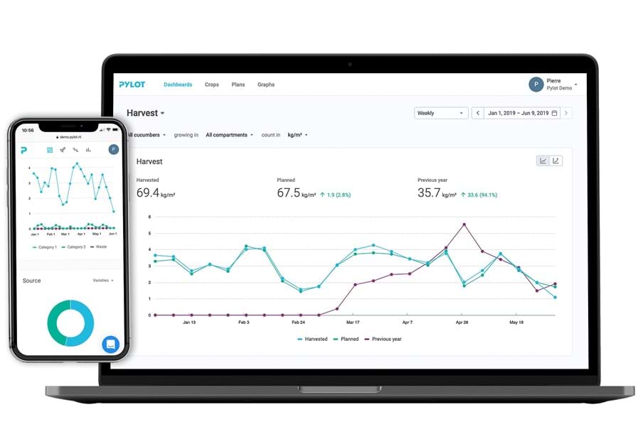 Getting the most out of your greenhouse is becoming easier every day. Thanks to PYLOT you are not only relying on experience, gut feeling and intuition anymore. With PYLOT you get usable and relevant data. PYLOT is a smart management system that analyses data from high-tech greenhouses, interprets it and presents it in a user-friendly dashboard in a clear and unambiguously manner. A platform that easily integrates with other software, learns, grows and constantly expands with new features. This way you are always up to date about the status of your crop and the performance of your greenhouse. You have all the tools at your disposal to analyse, make decisions and adjustments to optimise your strategy. Data with a purpose. It is therefore not without reason that PYLOT has been embraced by growers, owners, crop consultants and investors all over the world. All with the same ambition: Grip on Growing.