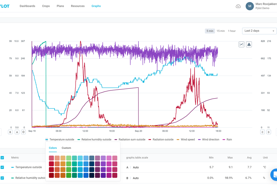 Another improvement is the ability to add multiple scales. There are plenty daily situations, when it is needed to compare several parameters with different ranges, e.g., temperature inside (from 15oC to 25oC) and CO2 dosing level (from 400 ppm to 1200 ppm) or comparisons for sun radiation and stem diameter growth. Thanks to this update, you will be able to handle such situations. You can easily set up separate scaling for each metric or combine them. Now you really can start getting into detail.