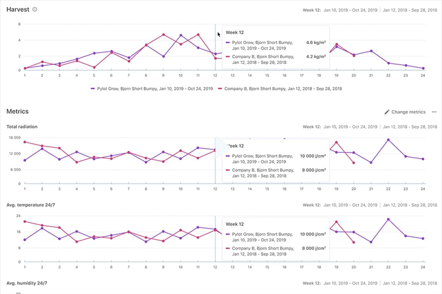 De benchmarking tool van PYLOT zorgt ervoor dat telers, telersgroepen of hun consultants eenvoudig vergelijkingen kunnen maken tussen bijvoorbeeld de prestaties van één gewas in verschillende kassen of gedurende meerdere perioden. Van het vergelijken van de gemiddelde werkelijke oogst tot klimaatgegevens uit de kas. Of van de verrichte arbeid tot de ingezette energiebronnen. In een oogopslag weet u welke kas het best rendeert en wat u zou kunnen doen om uw plantstrategie te optimaliseren. Vergelijken en verder kijken.