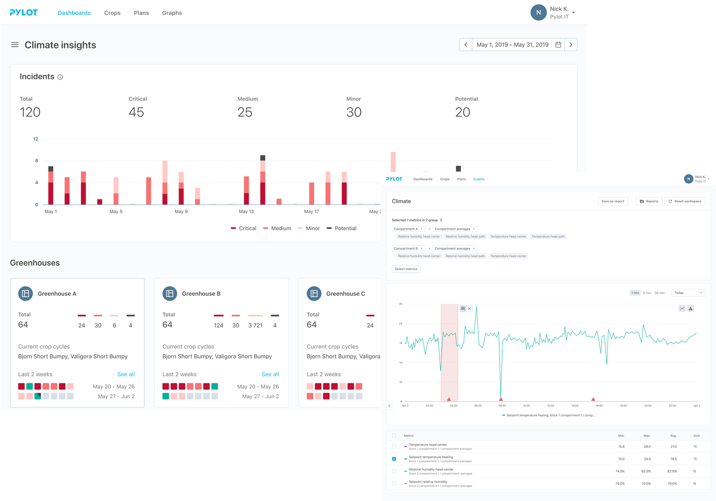 Met de feature Climate Insights legt PYLOT incidenten vast die het kasklimaat verstoren en schadelijk voor uw gewas kunnen zijn. Met slimme, zelflerende algoritmen worden automatisch afwijkingen weergegeven die niet wenselijk zijn voor het gewas. Op uw dashboard ziet u heel snel wat er mis is gegaan en kunt u snel handelen en zorgen dat deze onverwachte afwijkingen in de toekomst kunnen worden voorkomen. Bijsturen en optimaliseren is zo eenvoudiger dan ooit.
