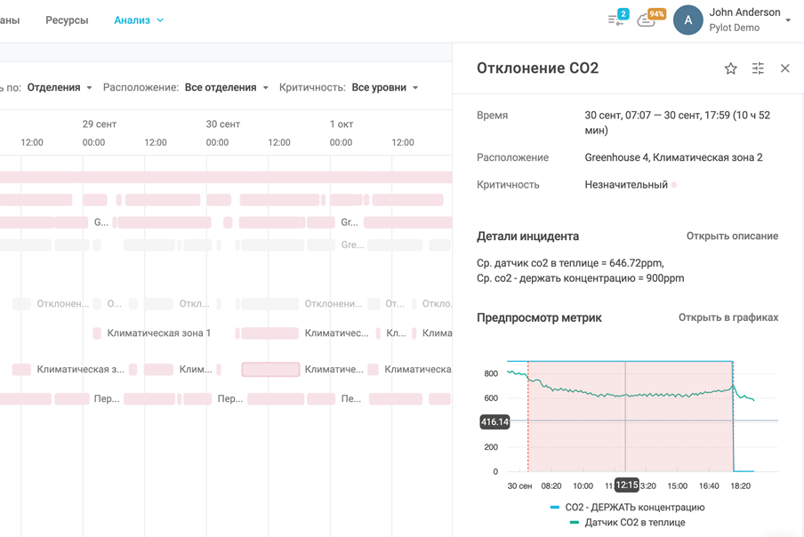 PYLOT понимает, что различные климатические зоны требуют особого внимания и анализа. С учетом этого алгоритмы платформы анализируют климатические параметры отдельно для каждой климатической зоны и генерируют соответствующие инциденты. Таким образом, пользователи получают точную и актуальную информацию, учитывающую особенности их отделения и условия выращивания.
